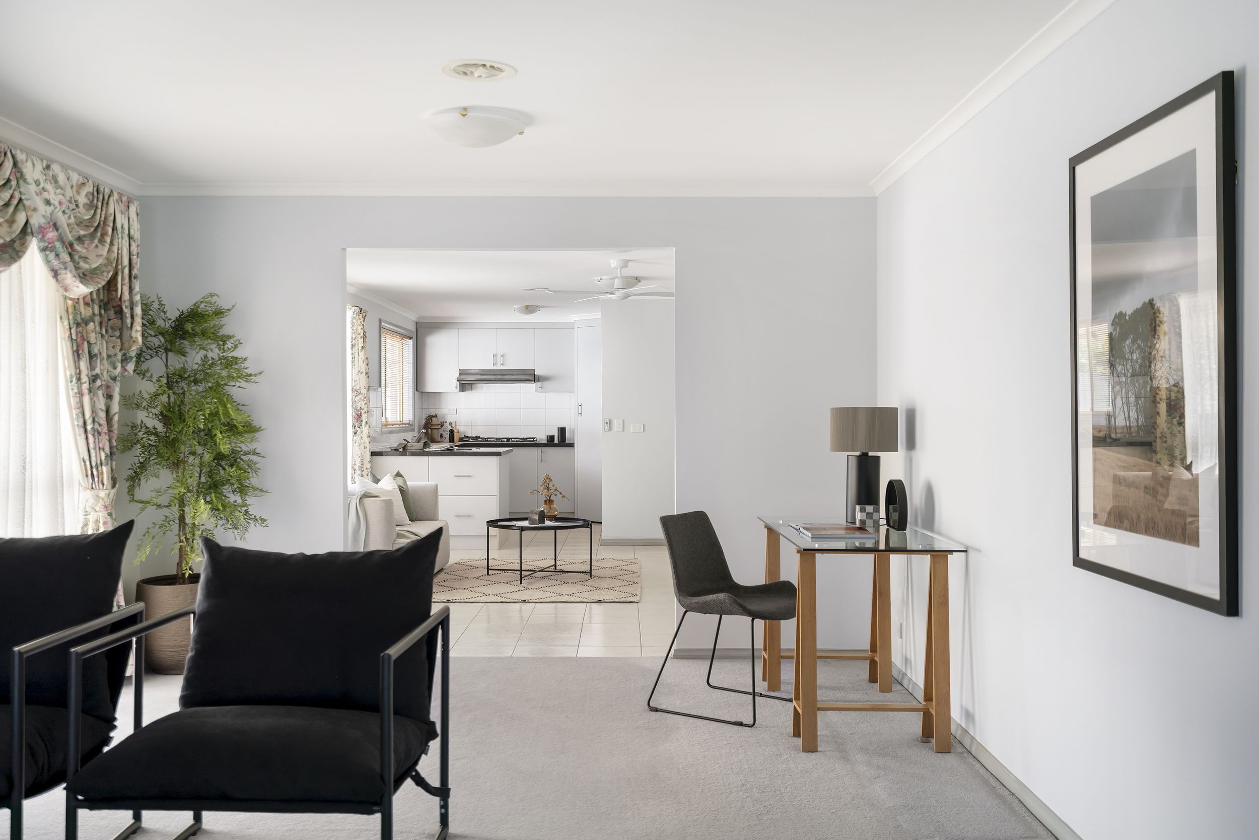 Behind its classic façade and established gardens, the front porch opens to a light-filled entry that immediately feels welcoming. At the front, a generous lounge creates a cosy haven for quiet evenings or lively gatherings, while the central open-plan living and dining area brings everyone together at the heart of the home. Comfort is assured with ducted heating, split-system cooling and ceiling fans throughout, ensuring year-round ease.